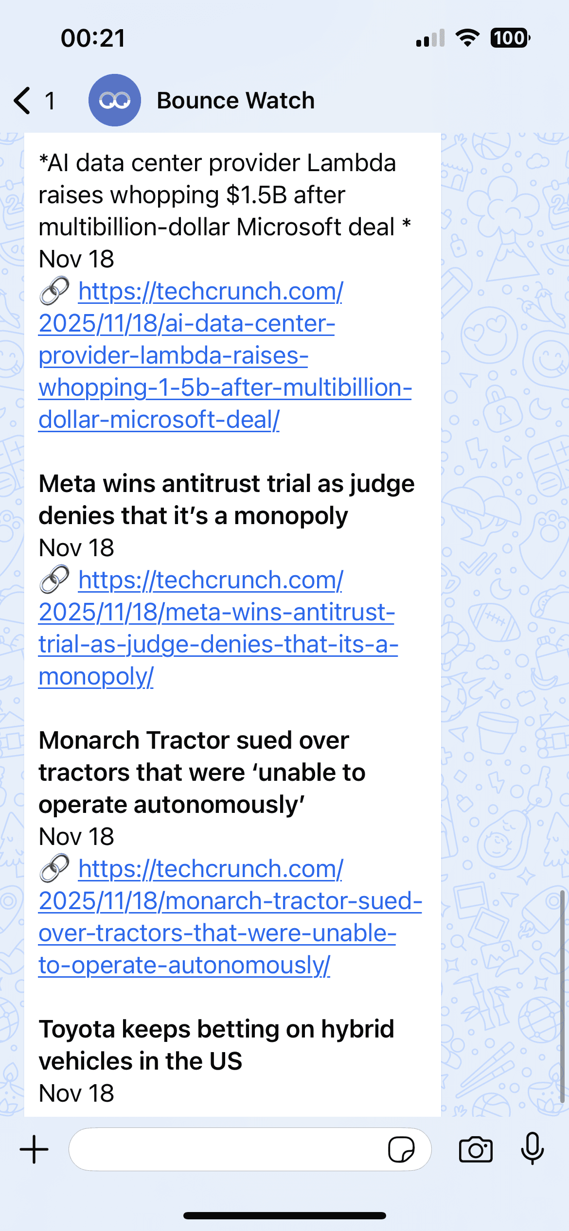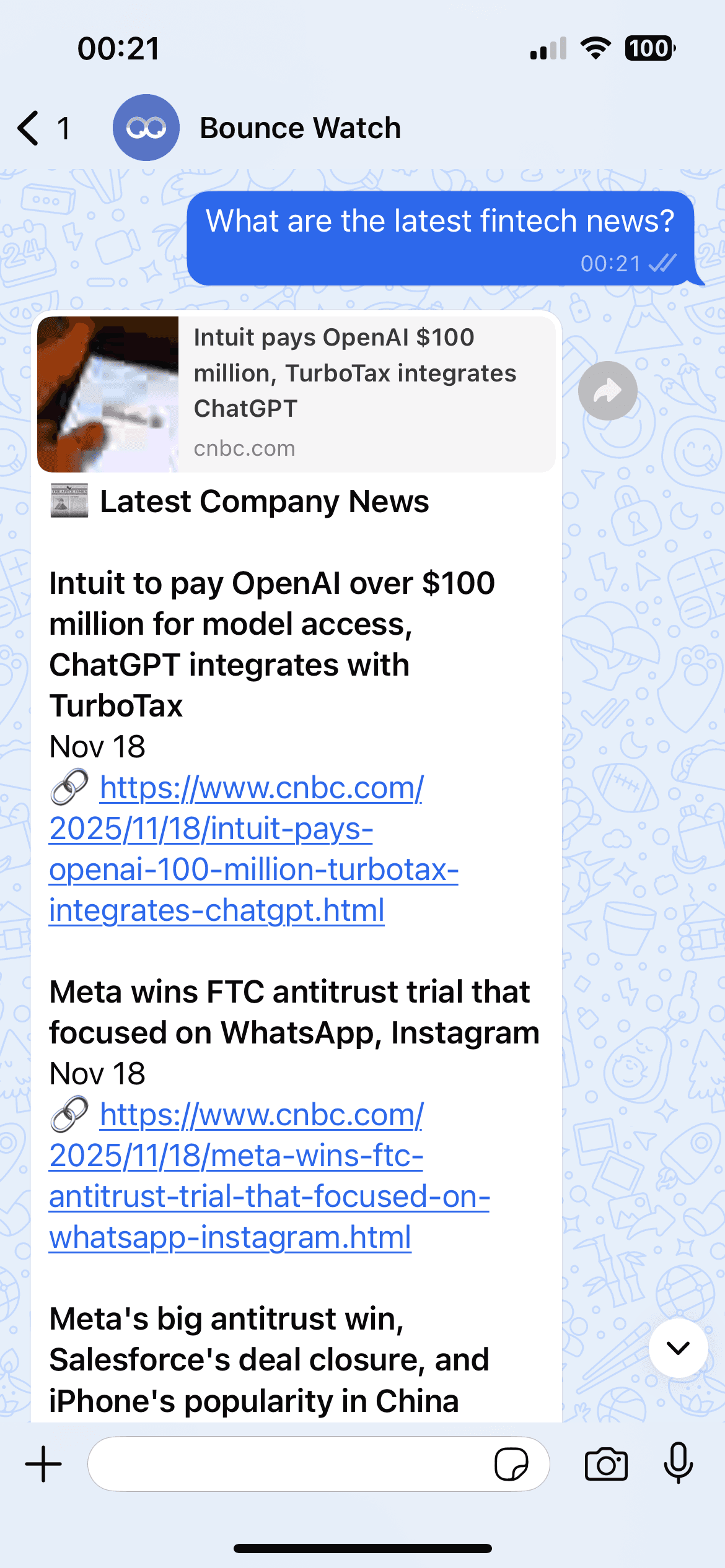 The Bounce Watch WhatsApp Bot turns your pipeline into a real-time conversation. Ask naturally — “What happened to Company X?” “Any new funding?” — and the bot retrieves structured intelligence instantly.
