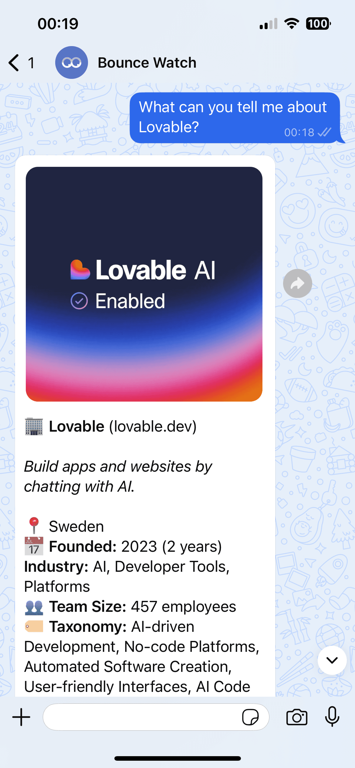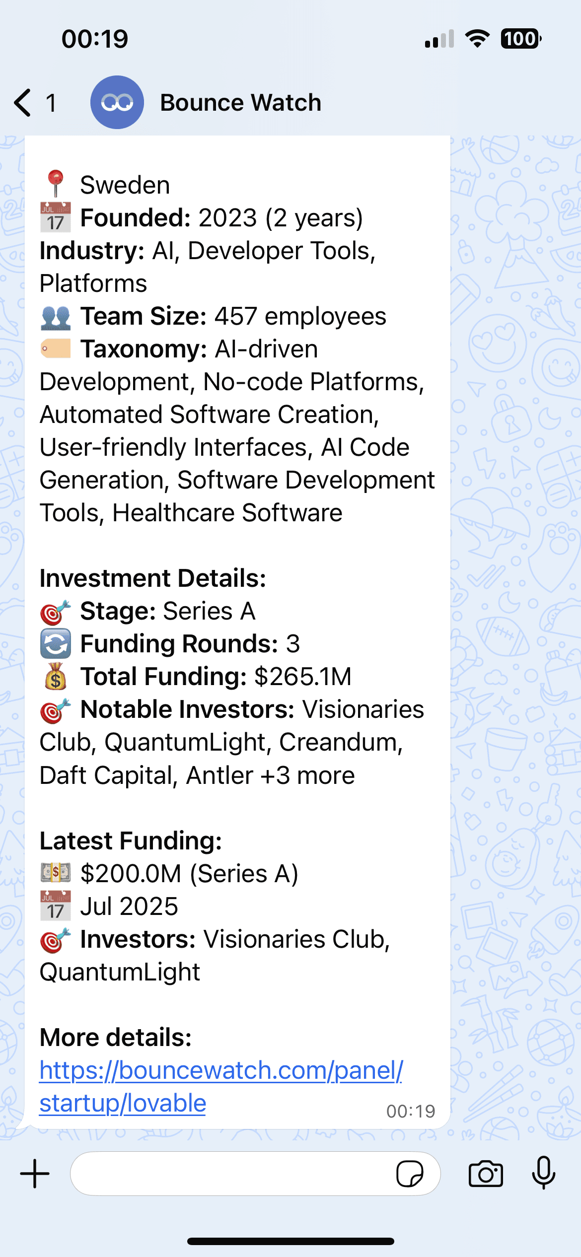 Connect instantly through the QR code and begin asking Bouncewatch anything — funding, teams, signals, insights.